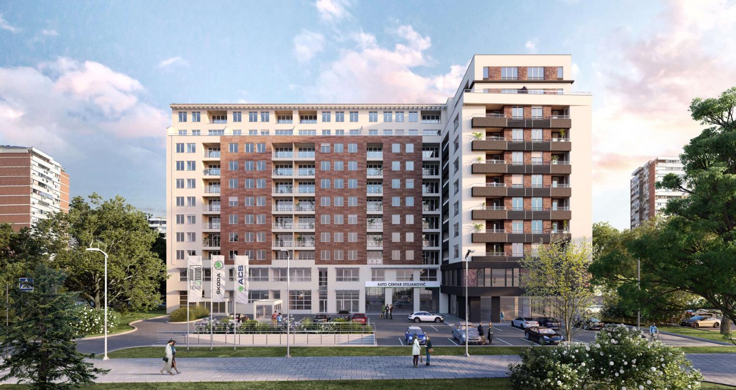 Residential building with auto show Auto Centr Stojanović on the first floor. The object is located in New Belgrade.